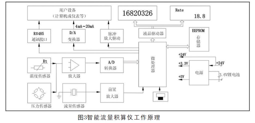 流量積算儀的原理框圖如圖3所示。CPU接收來自前置放大器的脈沖信號和經(jīng)A/D轉(zhuǎn)換器得到的壓力溫度信號,經(jīng)過運(yùn)算最終得到瞬時(shí)流量、累積流量、溫度和壓力值。同時(shí),在LCD上顯示這些參數(shù)。流量顯示既可顯示標(biāo)況流量,也可顯示工況流量。儀表上的三個(gè)功能鍵,鍵、鍵和鍵可對內(nèi)部參數(shù)進(jìn)行設(shè)定。